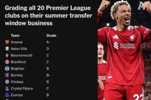 TA为英超20队夏窗评级:利物浦A,枪手A-,蓝军曼联热刺B,曼城B-