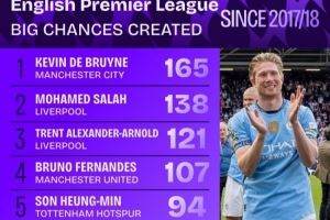 体育资讯9月7日讯 数据机构squakwa统计了17-18赛季以来的英超创造重大机会情况,德布劳内力压萨拉赫居首。